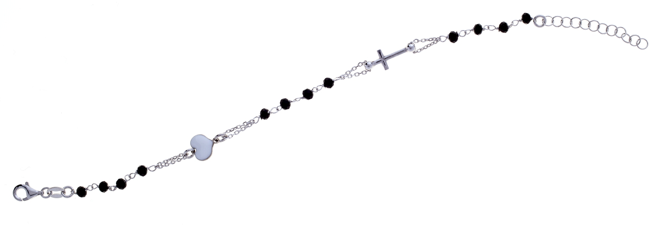 Bracciale rosario in argento925 Prega & Ama con pietre nere e cuore smaltato bianco -cod.61005